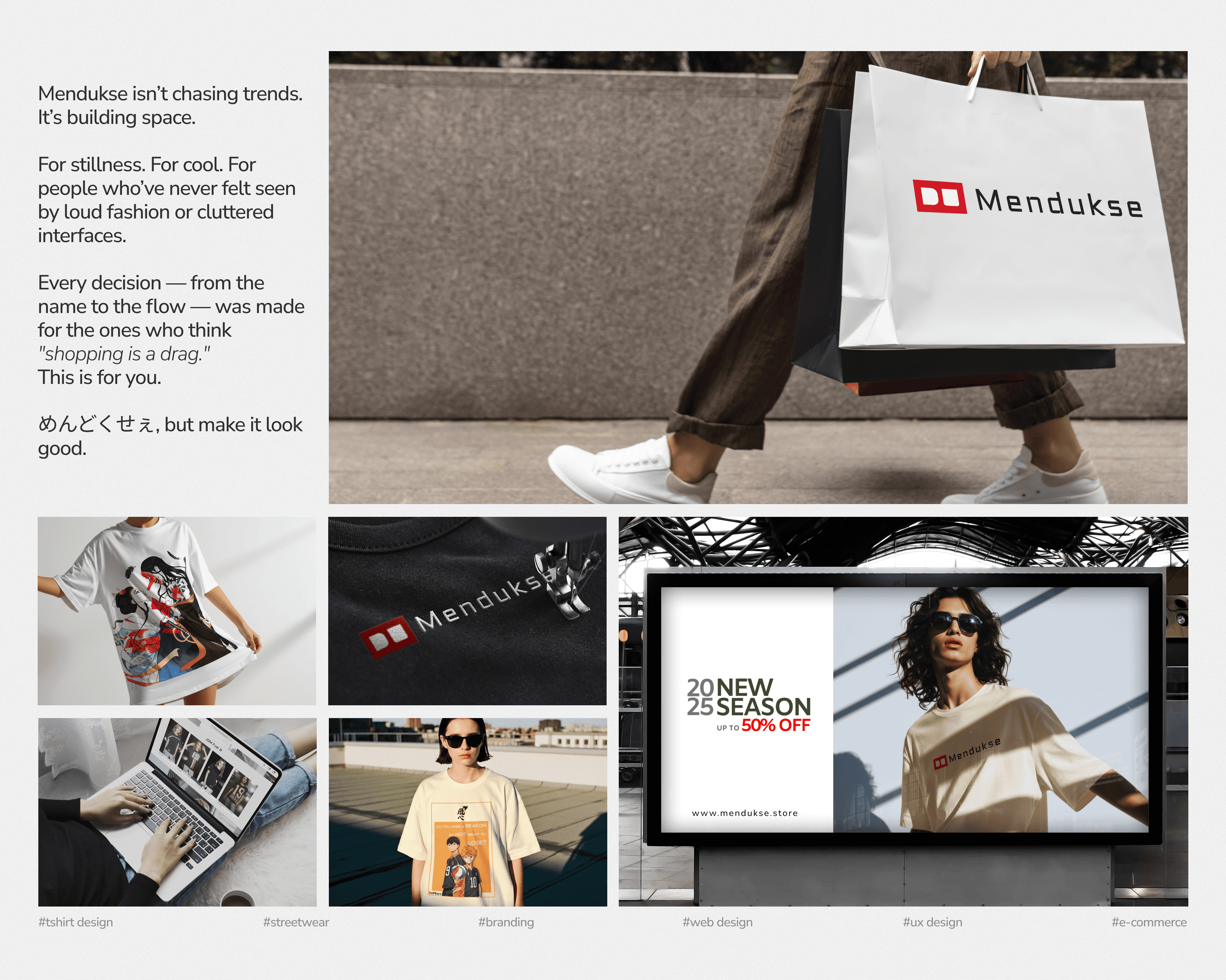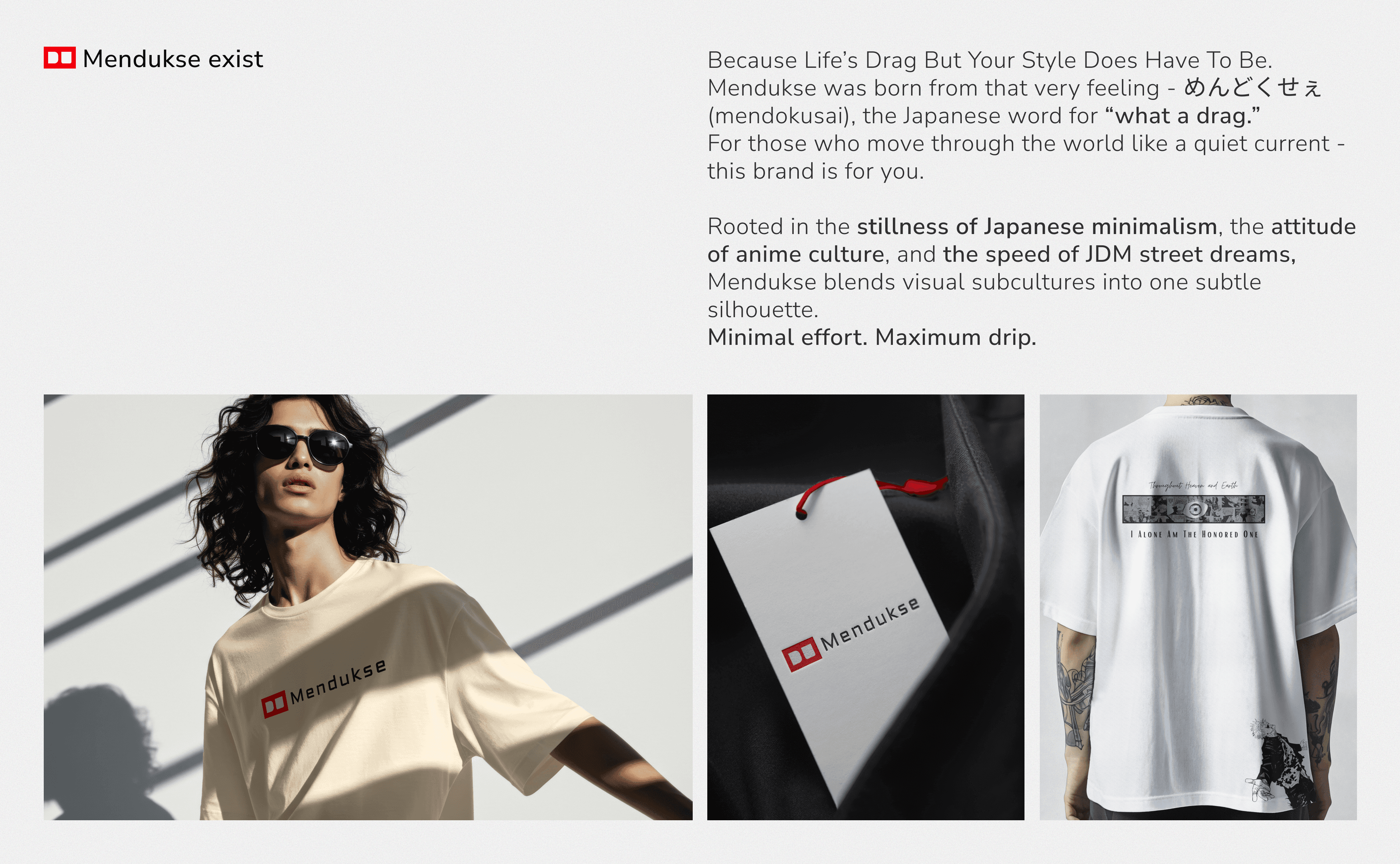 Mendukse — Because finding cool T-shirts shouldn’t be a drag. Born from the Japanese word めんどくせぇ (mendokusai), meaning "too much hassle," Mendukse is for those who move through the world with quiet confidence. Inspired by anime calm, JDM culture, and monochrome minimalism, it’s a go-to brand for effortless drip — no overthinking, no scrolling fatigue.